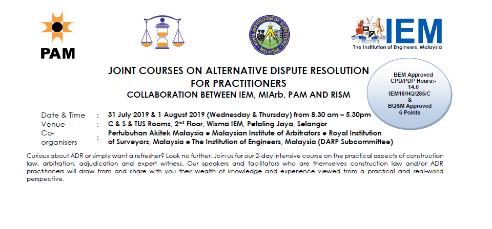 MIArb in collaboration with IEM, PAM AND RISM will be conducting a two-day “Joint Courses on Alternative Dispute Resolution for Practitionersâ€.