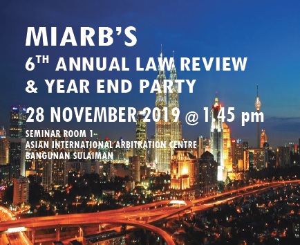 It gives us great pleasure to invite you to the Malaysian Institute of Arbitrators’ 6th Annual Law Review on 28 November 2019 at Seminar Room 1, Asian International Arbitration Centre, Bangunan Sulaiman. We have put together an interesting programme.
