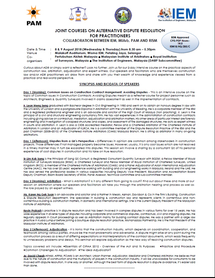 MIARB in collaboration with IEM, PAM AND RISM will be conducting a two days “Joint Courses on Alternative Dispute Resolution for Practitionersâ€.